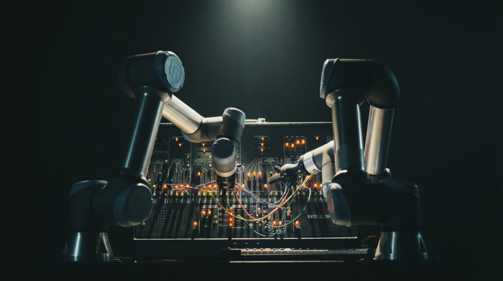 “At the heart of this innovative concept are two industrial robotic arms, each meticulously programmed with dexterity and precision of a musician. Visually captivating, the installation features the robotic arms gracefully navigating the semi-modular rig and array of keys, patching cables, and manipulating faders knobs with mesmerizing fluidity. These choreographed movements give rise to a unique presentation of sounds and gestures that differs from the capabilities of human performance.